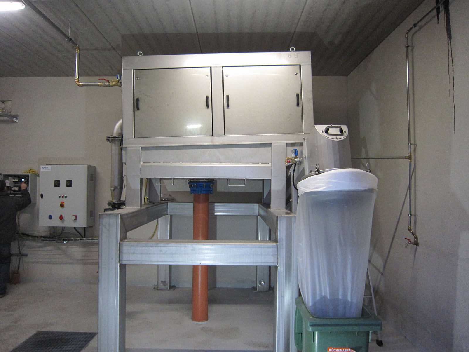 Um diese Anlagenteilen hinsichtlich Schmutzfracht zu entlasten, wurde von ABZ in einem Fertigteilbetonbehälter eine Doppelpumpstation errichtet, in der die Abwässer gesammelt werden. Bei der Auswahl der Pumpenanlage wurde besonderes Augenmerk auf die schonende Förderung des Mediums gelegt, um die empfindliche Struktur der Inhaltsstoffe nicht zu zerstören. Das nachfolgende innenbeschickte Trommelsieb CFS trennt die Partikel sicher und zuverlässig aus dem Abwasserstrom ab und übergibt diese in eine Spiralpresse HXP zur Entwässerung und Kompaktierung. Durch die vollständige Kapselung der Anlagenteile werden Emmissionen auf ein Mindestmaß reduziert.